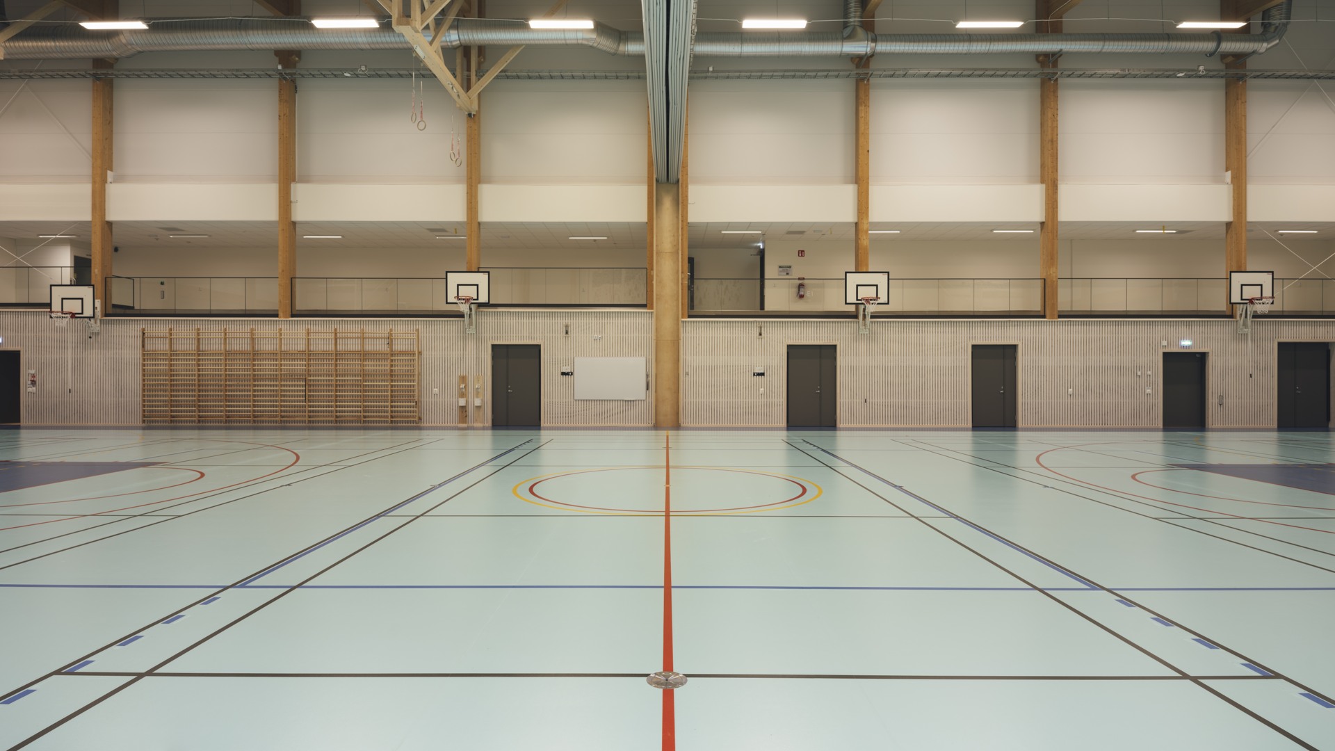 Projektet omfattar en totalyta om cirka 2 870 kvm och innehåller en fullstor A-hall med läktarplatser längs ena långsidan, en mindre B-hall samt en separat gymnastikhall utrustad med trampolin och justerbara madrasser. Hallarna är flexibla och kan delas av med ridåväggar, vilket gör det möjligt att bedriva undervisning för flera klasser samtidigt.