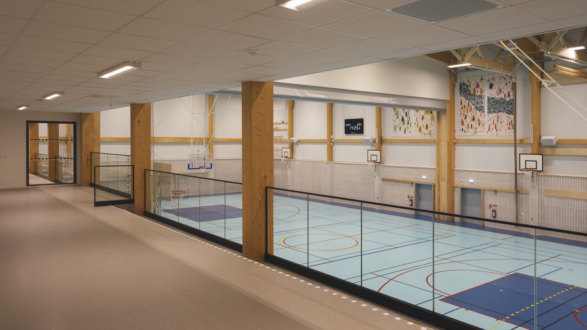 Byggnaden är uppförd med en limträkonstruktion som bidrar till en trivsam och funktionell miljö samt till ett hållbart byggande.